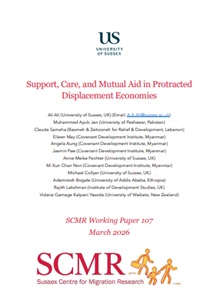 In settings of protracted displacement, external sources of material support typically dry-up when international donors lose interest in any given conflict and ensuing displacement crisis. Populations in those settings must rely on different forms of support, financial, and non-financial, with some reciprocal or mutual in their nature. The aim of this paper is to show how displacement affected populations provide and receive different forms of support, and the importance of non-financial acts of care and support in protracted displacement economies. It also considers mutual aid by discussing the reciprocal features of this support. To do so, we present some qualitative and quantitative empirical findings from a major three-year-long research project that spanned across five countries, with four discussed here, and three sites in each of those countries. The extensive original dataset consists of over 15,000 household surveys, 682 qualitative interviews, 60 focus groups and stakeholder workshops, as well as five film-making workshops. The paper presents research findings from Ethiopia, Lebanon, Myanmar, and Pakistan.